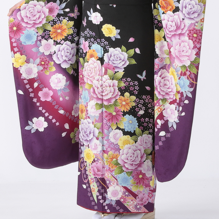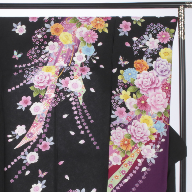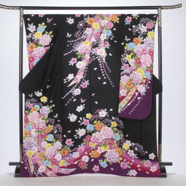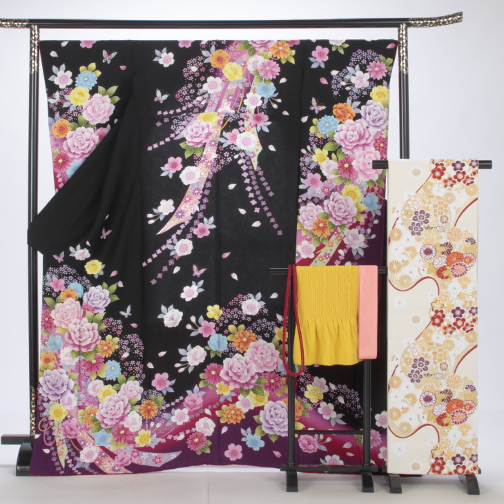 振袖 購入 フルセット Lサイズ 成人式 着物 【黒系】【中古】【状態:A】【f0214322】