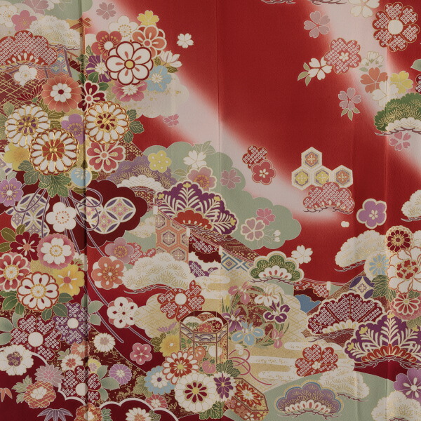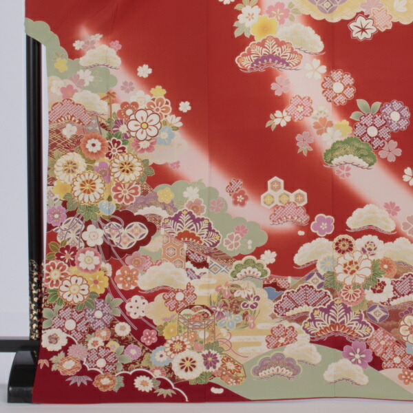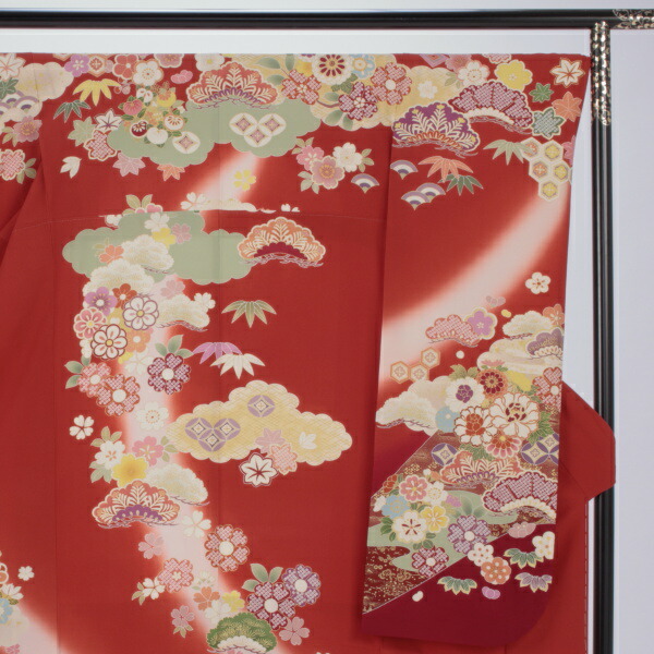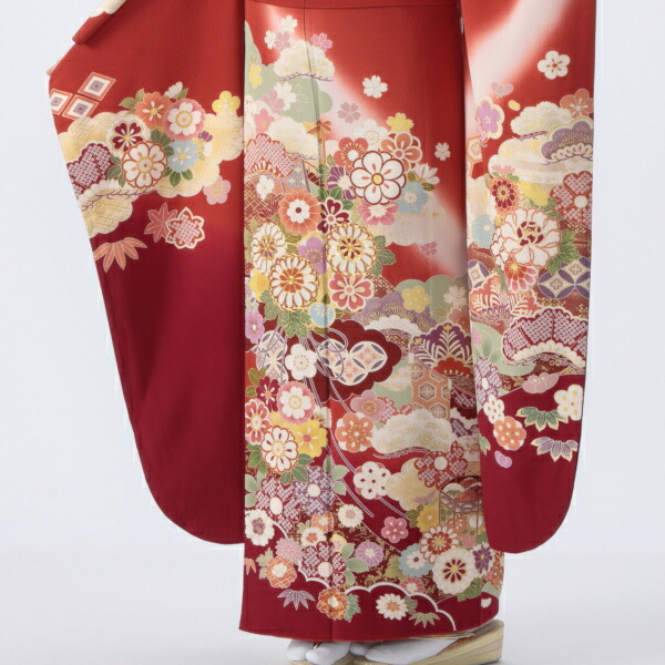 雲取りと大きめの松が存在感のある赤の振袖は、まさに賑やかな古典の王道というべく、様々な縁起の良い吉祥文様に彩られています。
